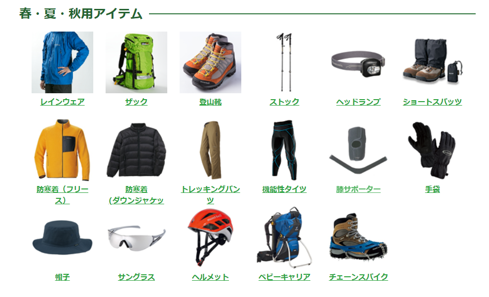 登山に必要な基本装備が一式揃ったセット。